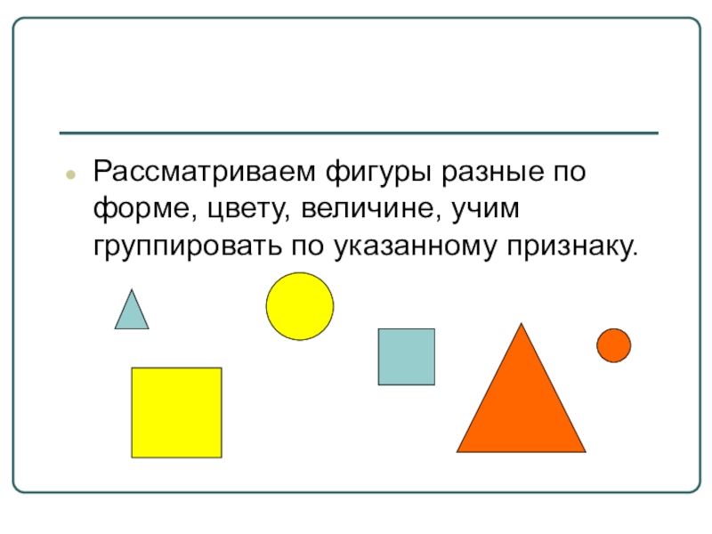 Рассматриваем фигуры разные по форме, цвету, величине, учим группировать по указанному признаку.