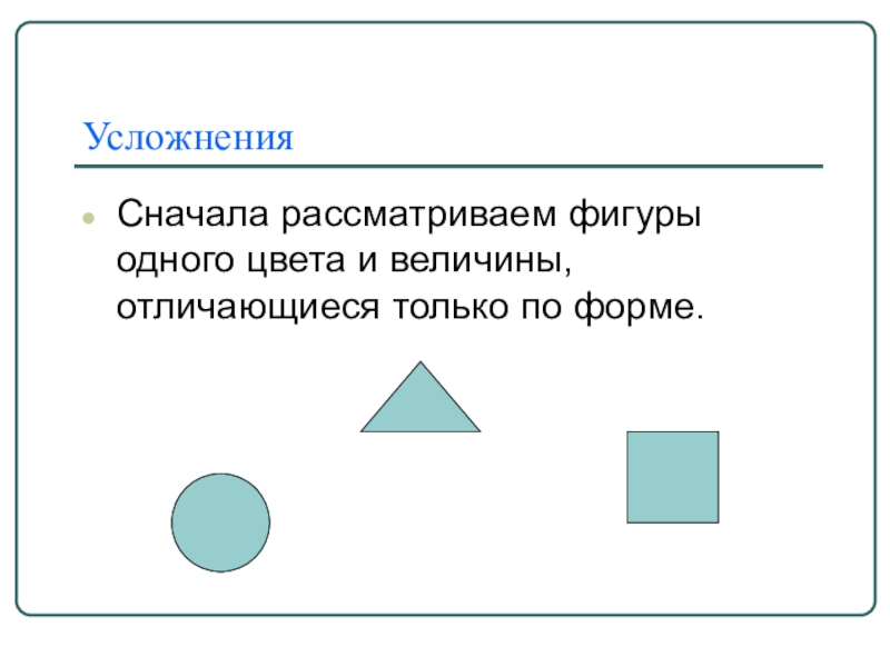 УсложненияСначала рассматриваем фигуры одного цвета и величины, отличающиеся только по форме.
