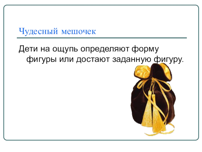 Чудесный мешочекДети на ощупь определяют форму фигуры или достают заданную фигуру.