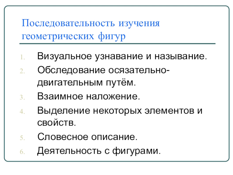 Последовательность изучения геометрических фигурВизуальное узнавание и называние.Обследование осязательно-двигательным путём.Взаимное наложение.Выделение некоторых элементов и свойств.Словесное описание.Деятельность с фигурами.