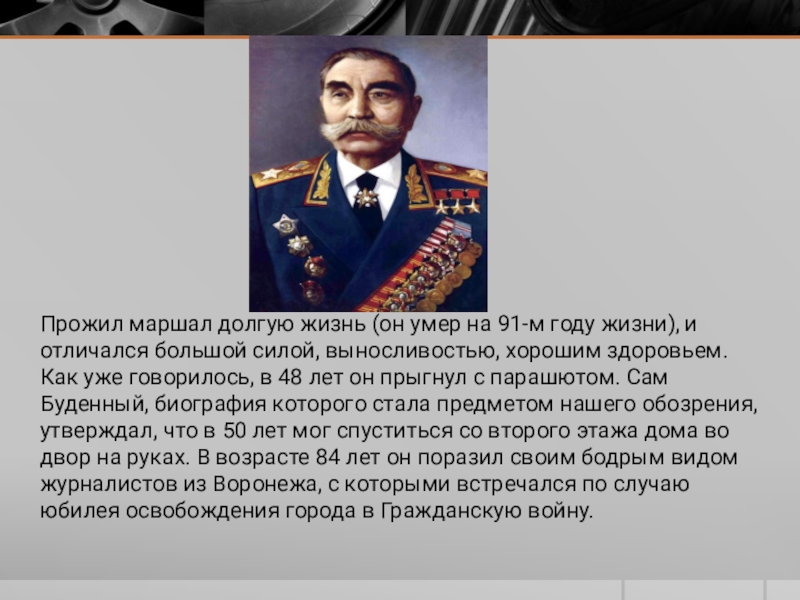 отличался большой силой, выносливостью, хорошим здоровьем. Как уже говорилось, в 48 лет он прыгнул с парашютом. Сам Буденный, биография которого стала предметом нашего обозрения, утверждал, что в 50 лет мог спуститься со второго этажа дома во двор на руках. В возрасте 84 лет он поразил своим бодрым видом журналистов из Воронежа, с которыми встречался по случаю юбилея освобождения города в Гражданскую войну.