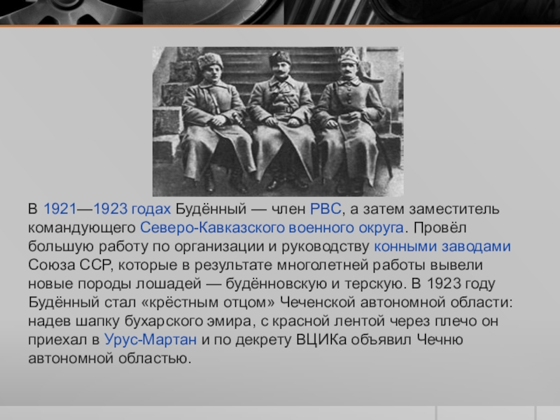 военного округа. Провёл большую работу по организации и руководству конными заводами Союза ССР, которые в результате многолетней работы вывели новые породы лошадей — будённовскую и терскую. В 1923 году Будённый стал «крёстным отцом» Чеченской автономной области: надев шапку бухарского эмира, с красной лентой через плечо он приехал в Урус-Мартан и по декрету ВЦИКа объявил Чечню автономной областью.