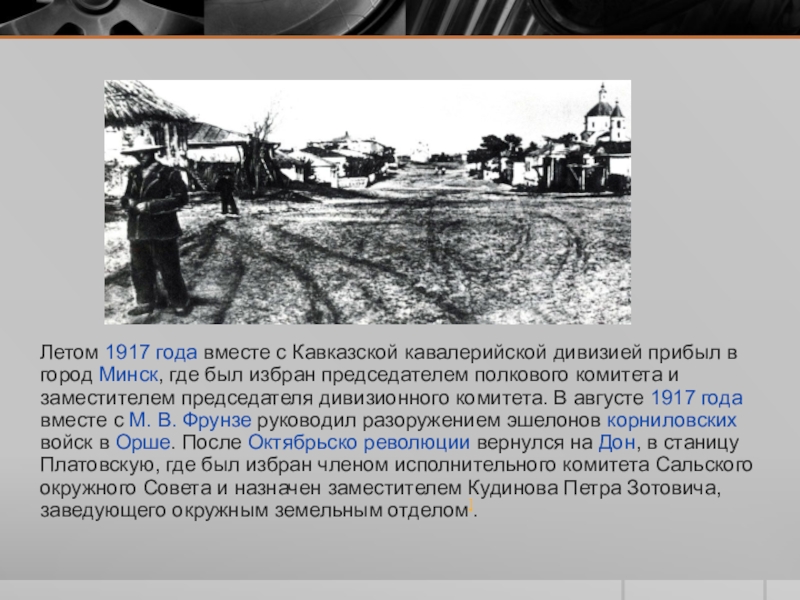 Слайд 6Летом 1917 года вместе с Кавказской кавалерийской дивизией прибыл в город