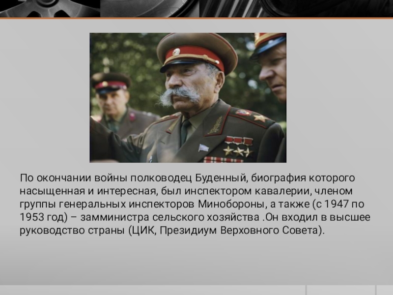 Слайд 10По окончании войны полководец Буденный, биография которого насыщенная и интересная, был