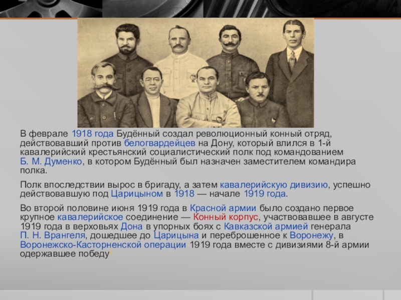 Слайд 7В феврале 1918 года Будённый создал революционный конный отряд, действовавший против