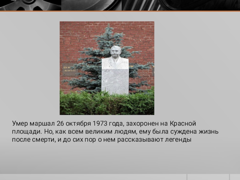 Слайд 12Умер маршал 26 октября 1973 года, захоронен на Красной площади. Но,