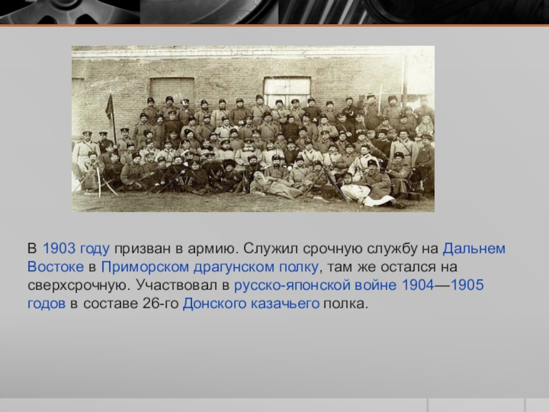 Слайд 4В 1903 году призван в армию. Служил срочную службу на Дальнем