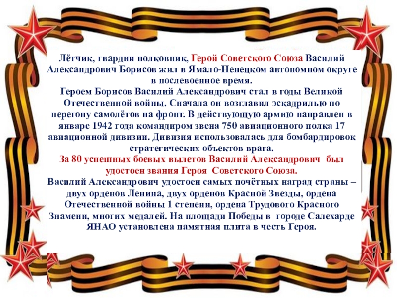 Слайд 19Лётчик, гвардии полковник, Герой Советского Союза Василий Александрович Борисов жил в
