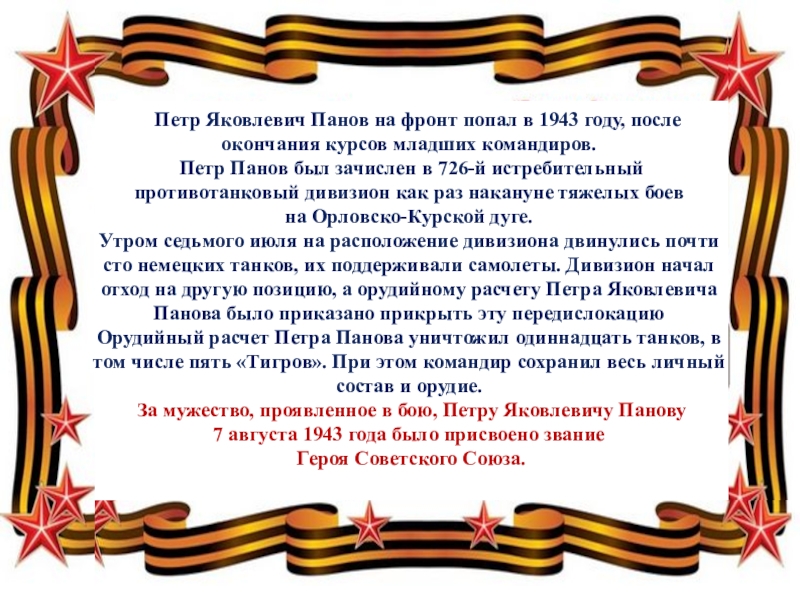 Слайд 21 Петр Яковлевич Панов на фронт попал в 1943 году,