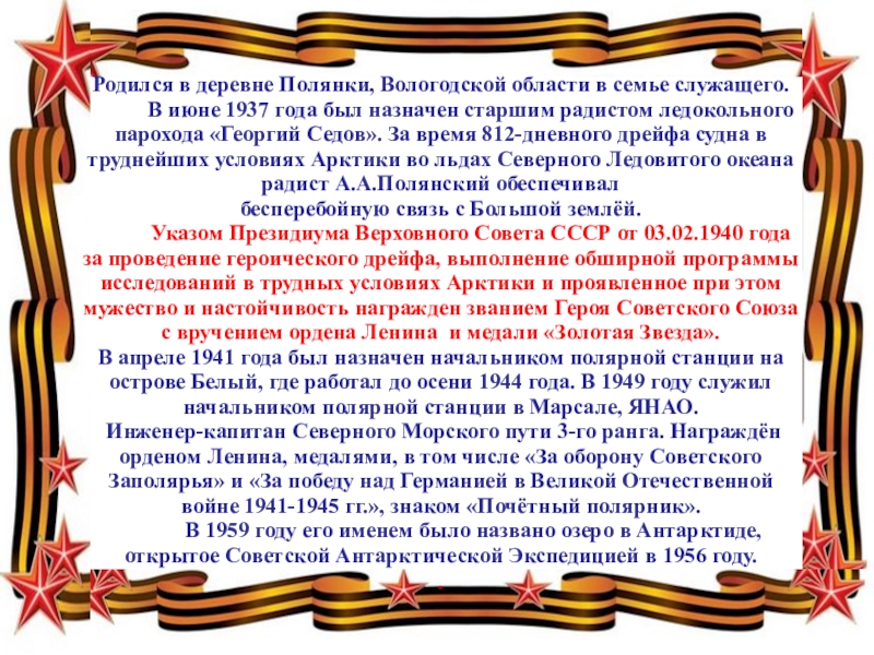 В июне 1937 года был назначен старшим радистом ледокольного парохода «Георгий Седов». За время 812-дневного дрейфа судна в труднейших условиях Арктики во льдах Северного Ледовитого океана радист А.А.Полянский обеспечивал