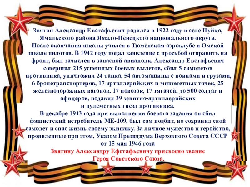Слайд 17Звягин Александр Евстафьевич родился в 1922 году в селе Пуйко, Ямальского