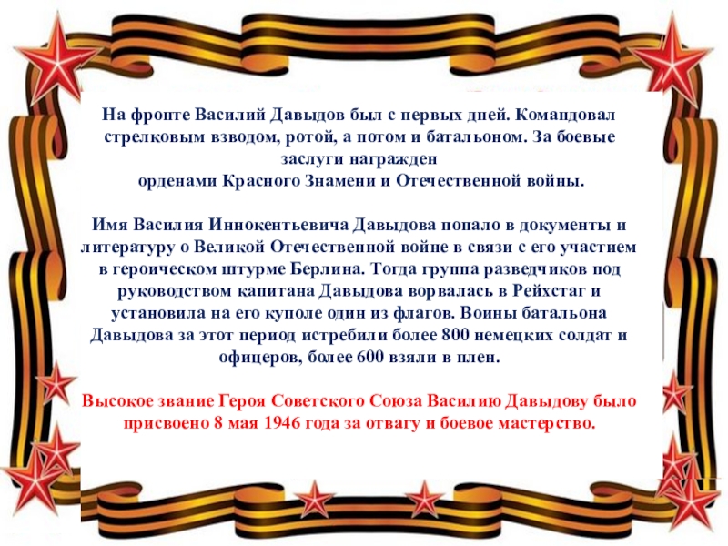 Слайд 13На фронте Василий Давыдов был с первых дней. Командовал стрелковым взводом,