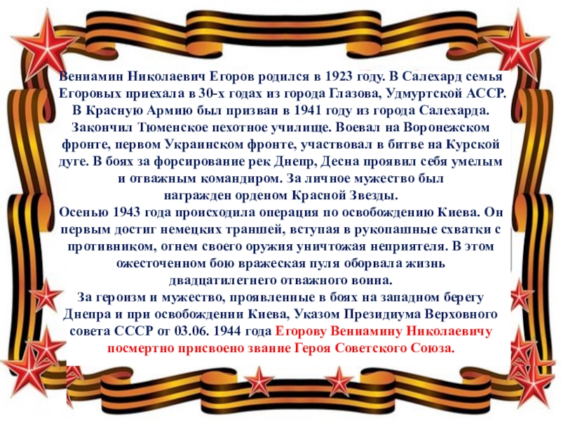Слайд 11Вениамин Николаевич Егоров родился в 1923 году. В Салехард семья Егоровых