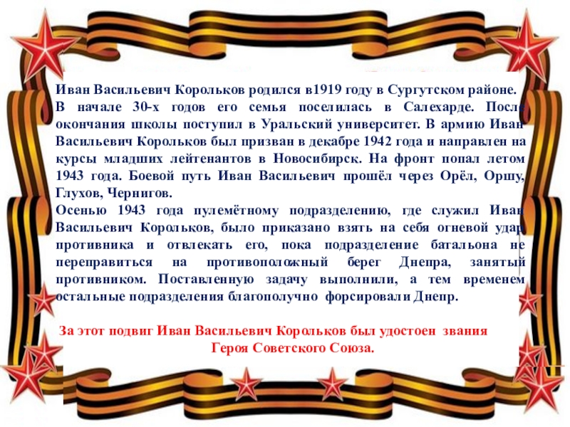 Слайд 15Иван Васильевич Корольков родился в1919 году в Сургутском районе.