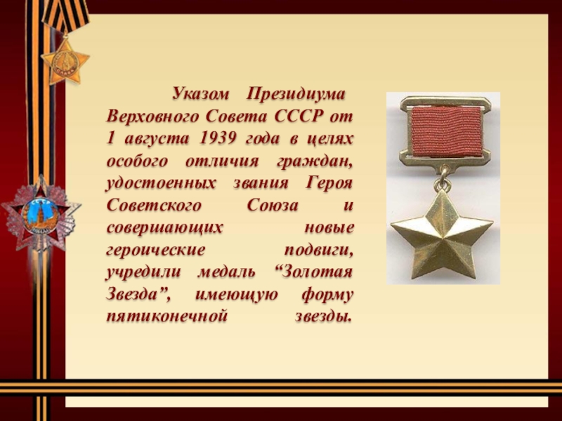 1939 года в целях особого отличия граждан, удостоенных звания Героя Советского Союза и совершающих новые героические подвиги, учредили медаль “Золотая Звезда”, имеющую форму пятиконечной звезды.