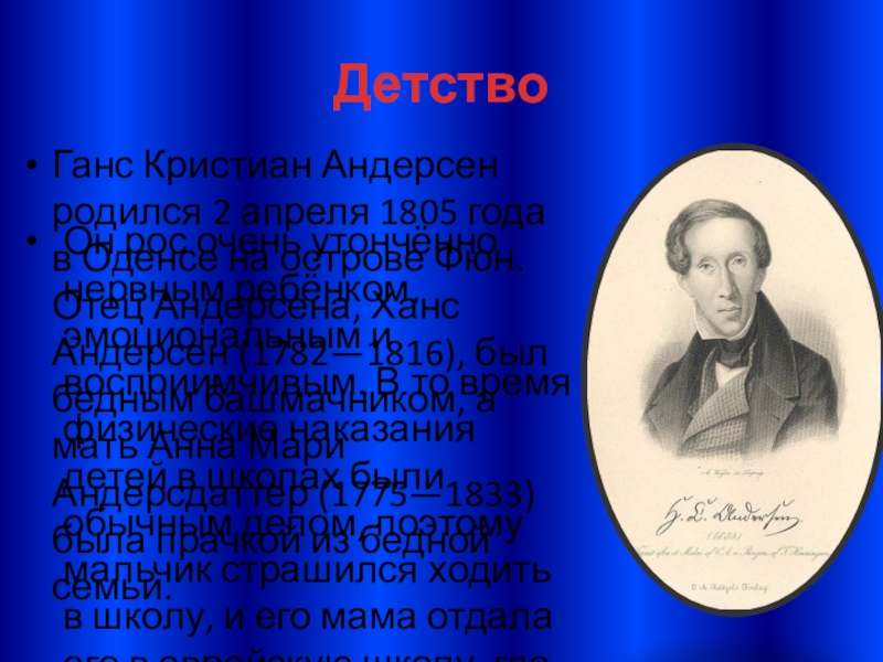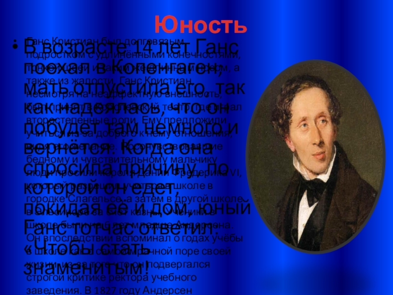Ганс Кристиан был долговязым подростком с удлинёнными конечностями, тонкой шеей и таким же длинным носом, а также из жалости, Ганс Кристиан, несмотря на неэффектную внешность, был принят в Королевский театр, где играл второстепенные роли. Ему предложили учиться из-за доброго к нему отношения, видя его желание. Посочувствовавшие бедному и чувствительному мальчику люди просили короля Дании Фредерика VI, который разрешил учиться в школе в городке Слагельсе, а затем в другой школе в Эльсиноре за счёт казны. Ученики в школе были на 6 лет младше Андерсена. Он впоследствии вспоминал о годах учёбы в школе как о самой мрачной поре своей жизни, из-за того что он подвергался строгой критике ректора учебного заведения. В 1827 году Андерсен завершил учёбу.