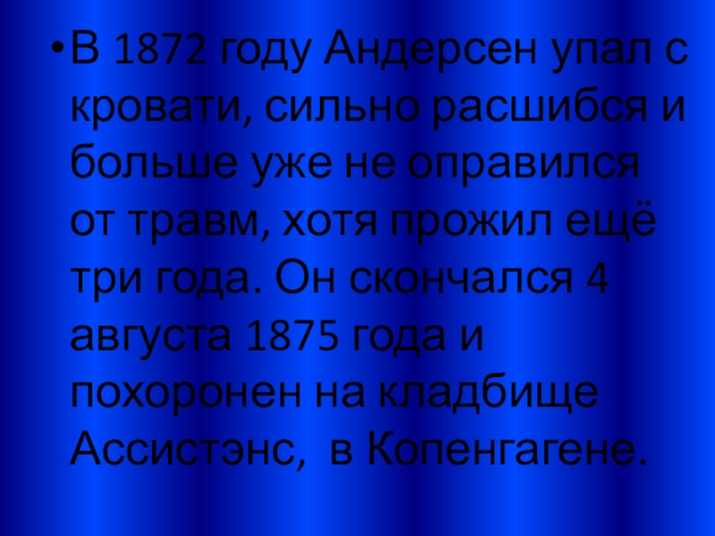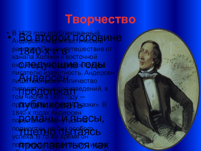 Во второй половине 1840-х и в следующие годы Андерсен продолжал публиковать романы и пьесы, тщетно пытаясь прославиться как драматург и романист.