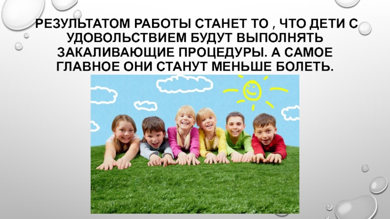 Результатом работы станет то , что дети с удовольствием будут выполнять закаливающие процедуры. А самое главное они