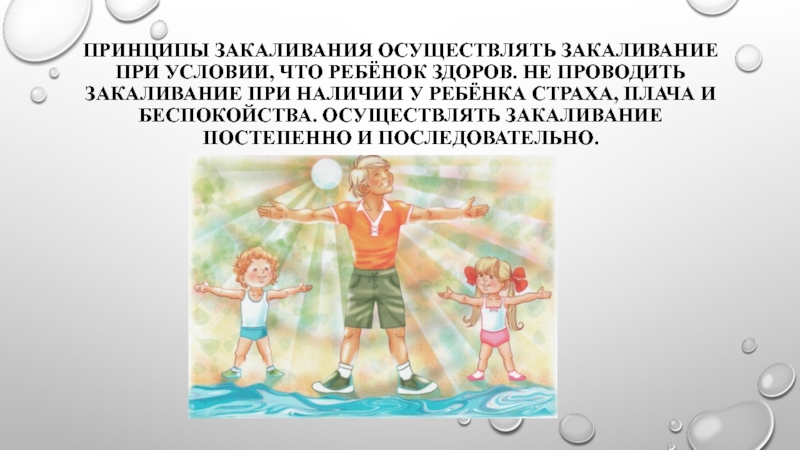 Слайд 6ПРИНЦИПЫ ЗАКАЛИВАНИЯ Осуществлять закаливание при условии, что ребёнок здоров. Не проводить