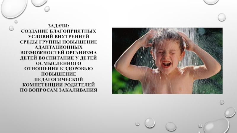 Слайд 4Задачи: создание благоприятных условий внутренней среды группы повышение адаптационных возможностей организма