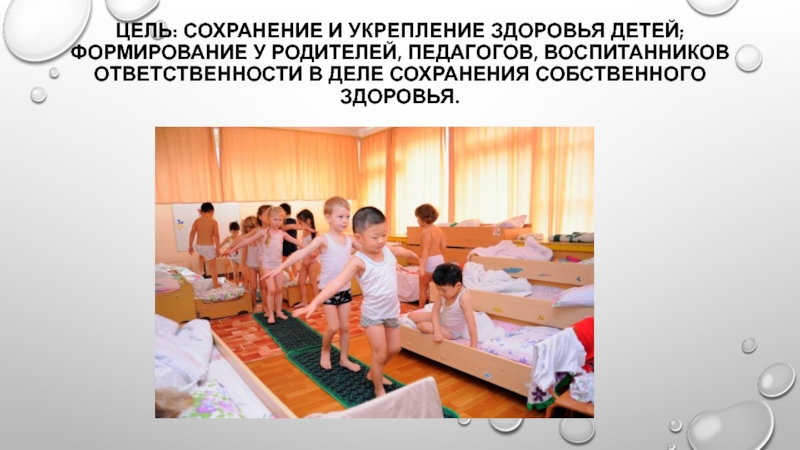 Слайд 3Цель: сохранение и укрепление здоровья детей; формирование у родителей, педагогов, воспитанников