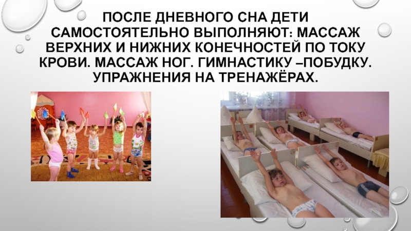 Слайд 8После дневного сна дети самостоятельно выполняют: массаж верхних и нижних конечностей