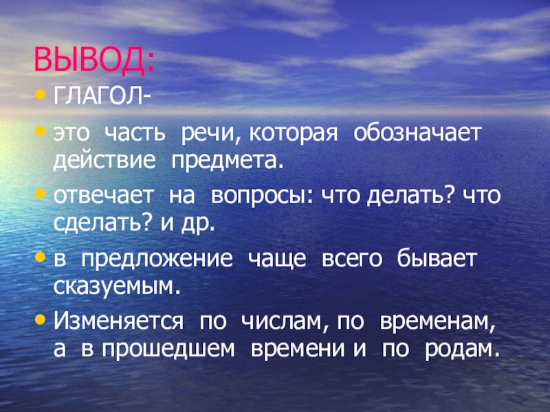 ВЫВОД:ГЛАГОЛ-это часть речи, которая обозначает действие предмета.отвечает на вопросы: что делать? что сделать? и др. в предложение