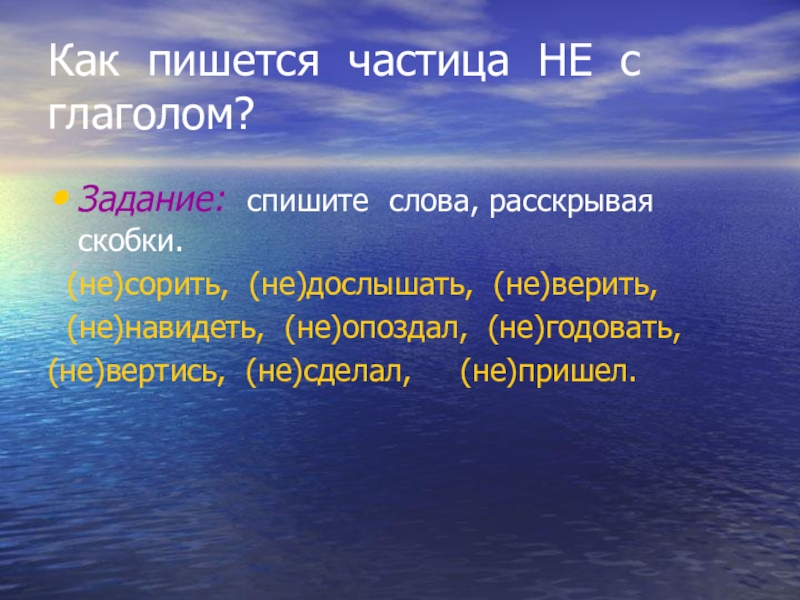 Как пишется частица НЕ с глаголом?Задание: спишите слова, расскрывая скобки. (не)сорить, (не)дослышать, (не)верить, (не)навидеть, (не)опоздал, (не)годовать,(не)вертись, (не)сделал,