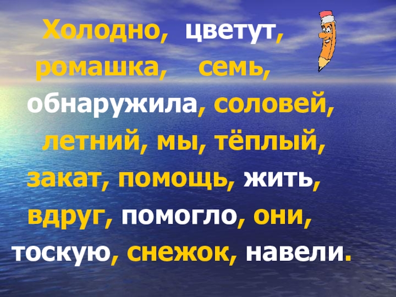 НАЗОВИТЕ ГЛАГОЛЫ.Холодно, цветут, ромашка,  семь, обнаружила, соловей,   летний, мы, тёплый, закат, помощь, жить, вдруг,