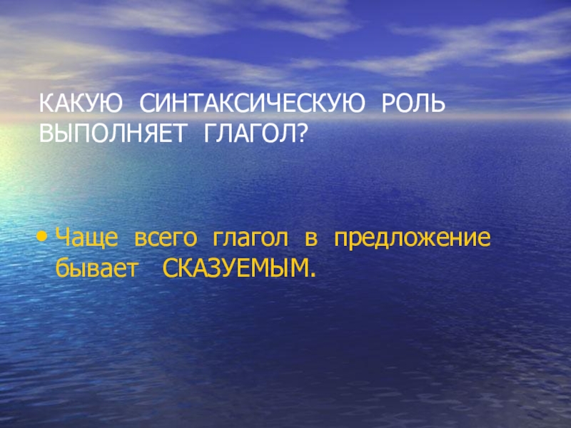 КАКУЮ СИНТАКСИЧЕСКУЮ РОЛЬ ВЫПОЛНЯЕТ ГЛАГОЛ?Чаще всего глагол в предложение  бывает  СКАЗУЕМЫМ.
