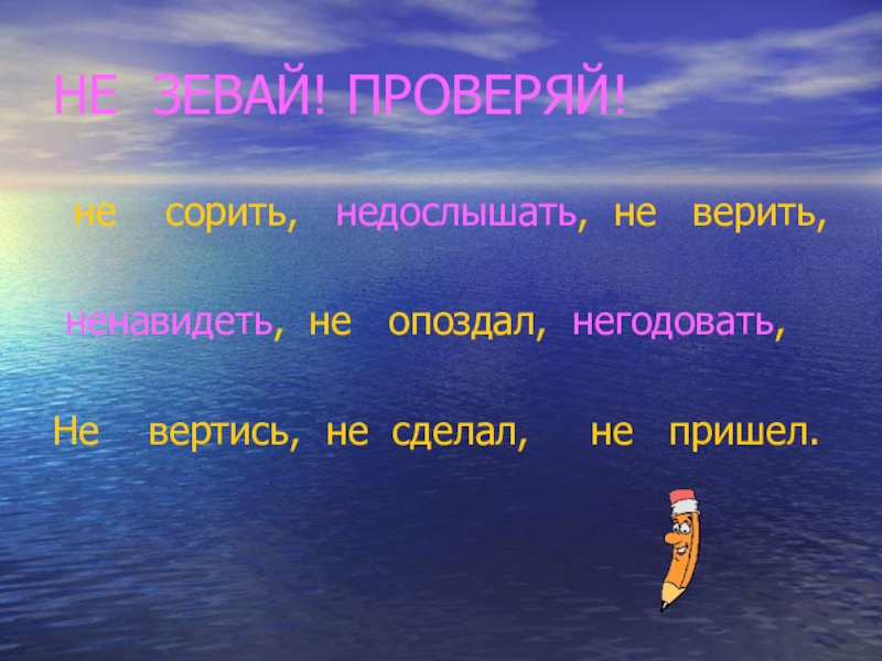 НЕ ЗЕВАЙ! ПРОВЕРЯЙ! не  сорить,  недослышать, не  верить, ненавидеть, не  опоздал, негодовать,Не