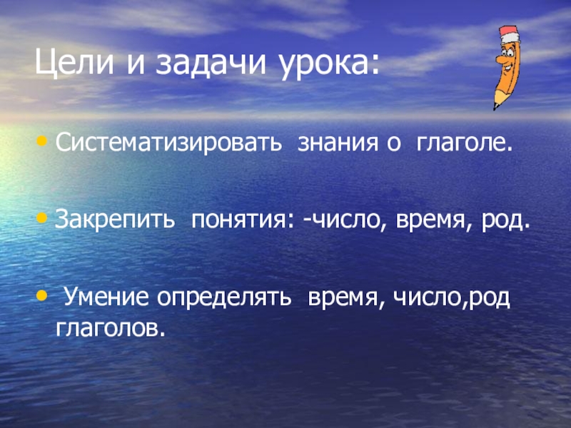 Цели и задачи урока:Систематизировать знания о глаголе.Закрепить понятия: -число, время, род. Умение определять время, число,род глаголов.