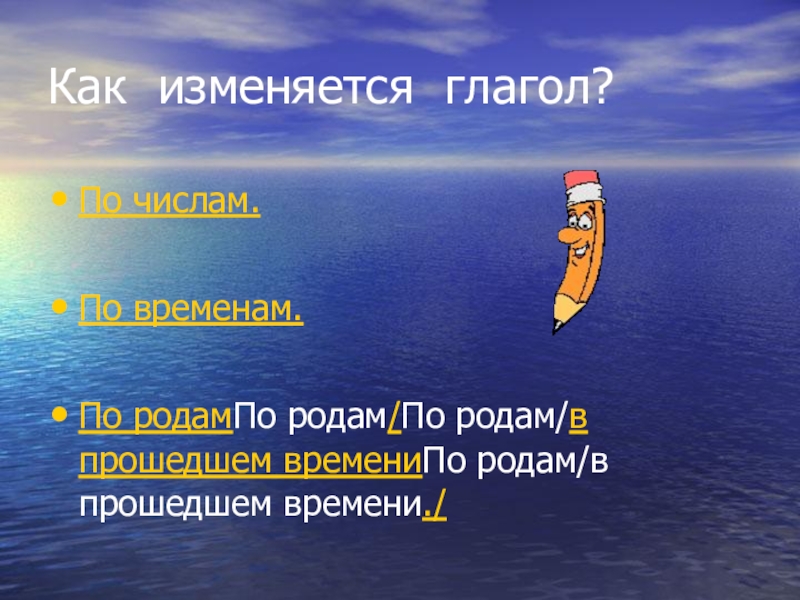 Как изменяется глагол?По числам.По временам.По родамПо родам/По родам/в прошедшем времениПо родам/в прошедшем времени./