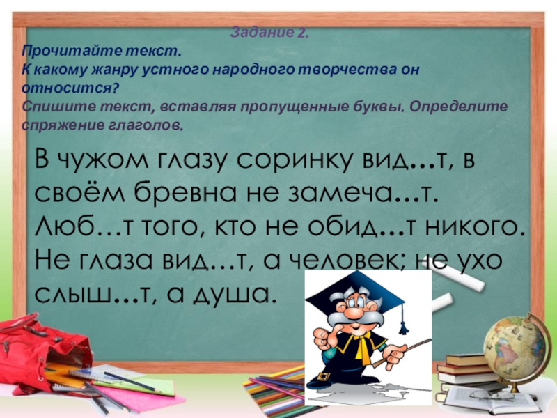 В чужом глазу соринку вид…т, в своём бревна не замеча…т. Люб…т того, кто не обид…т никого. Не глаза вид…т, а человек; не ухо слыш…т, а душа.