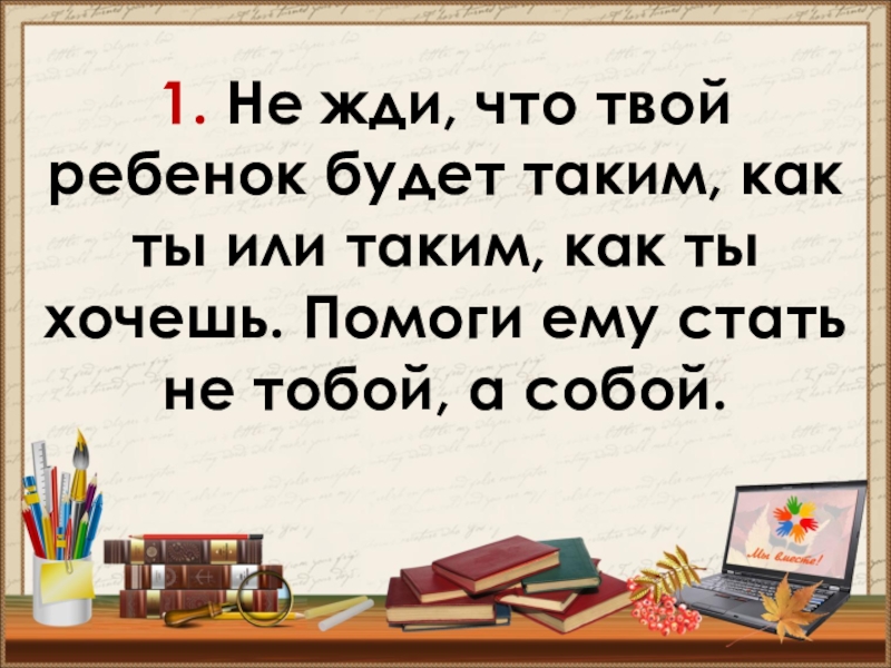 Слайд 121. Не жди, что твой ребенок будет таким, как ты или