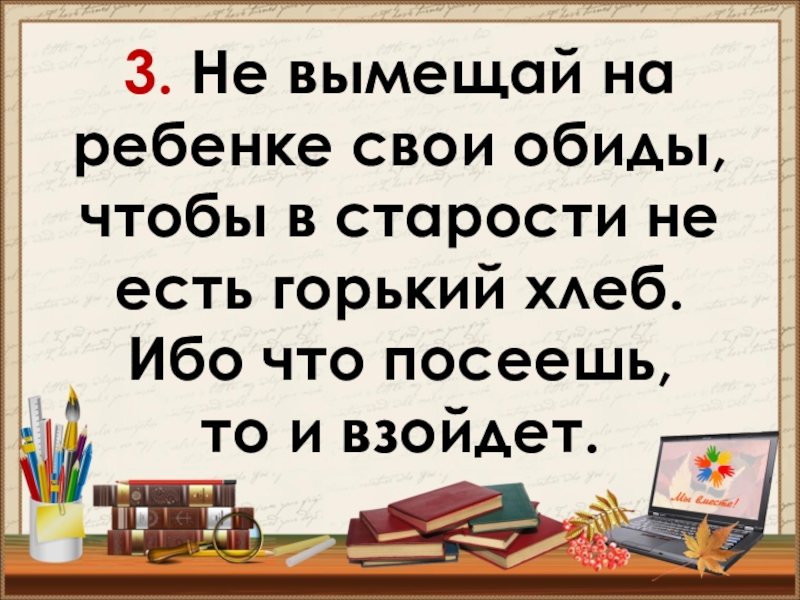 Слайд 143. Не вымещай на ребенке свои обиды, чтобы в старости не