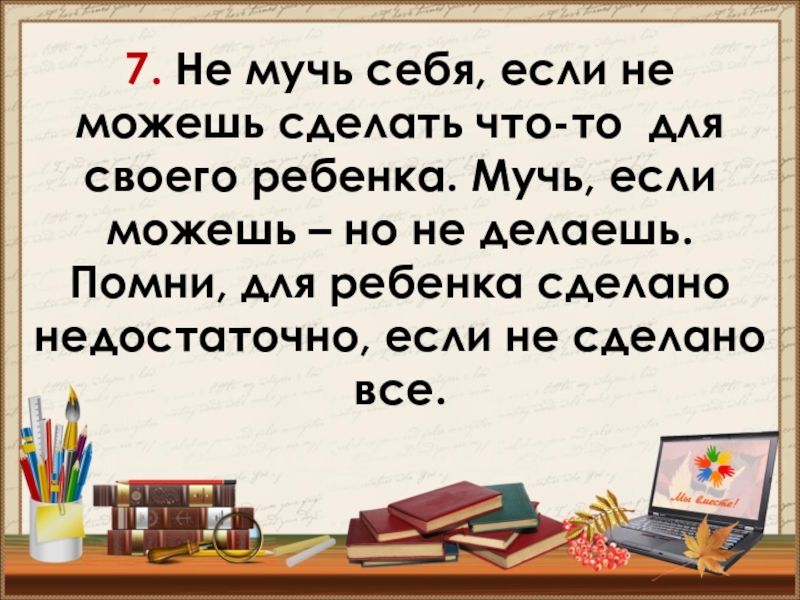 ребенка. Мучь, если можешь – но не делаешь. Помни, для ребенка сделано недостаточно, если не сделано все.