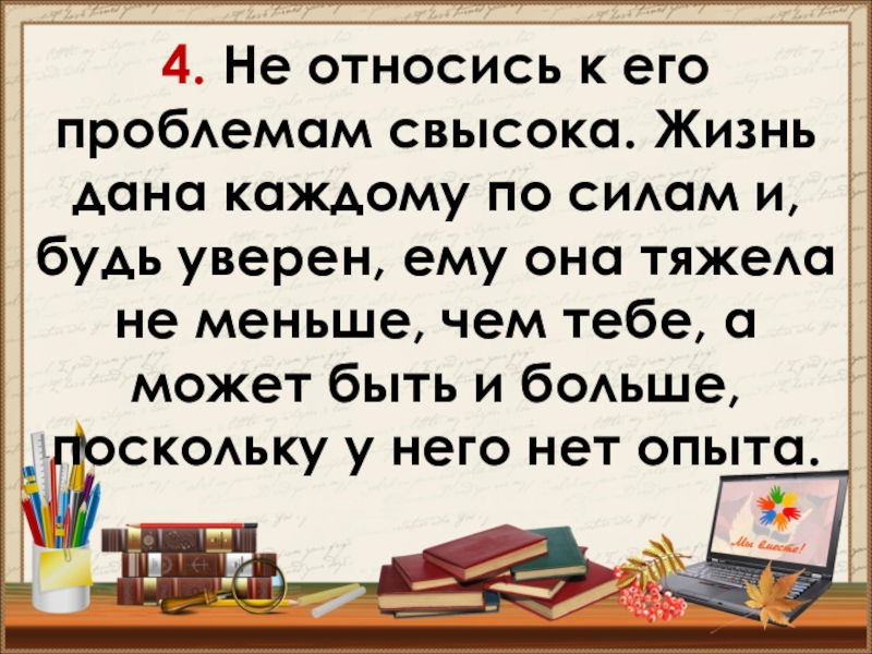 Слайд 154. Не относись к его проблемам свысока. Жизнь дана каждому по