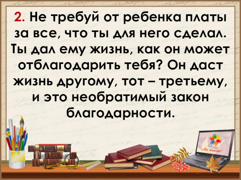Слайд 132. Не требуй от ребенка платы за все, что ты для