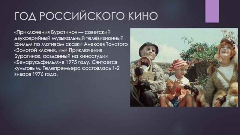 мотивам сказки Алексея Толстого «Золотой ключик, или Приключения Буратино», созданный на киностудии «Беларусьфильм» в 1975 году. Считается культовым. Телепремьера состоялась 1-2 января 1976 года.