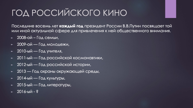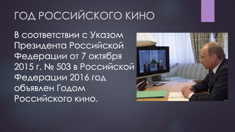 октября 2015 г. № 503 в Российской Федерации 2016 год объявлен Годом Российского кино.