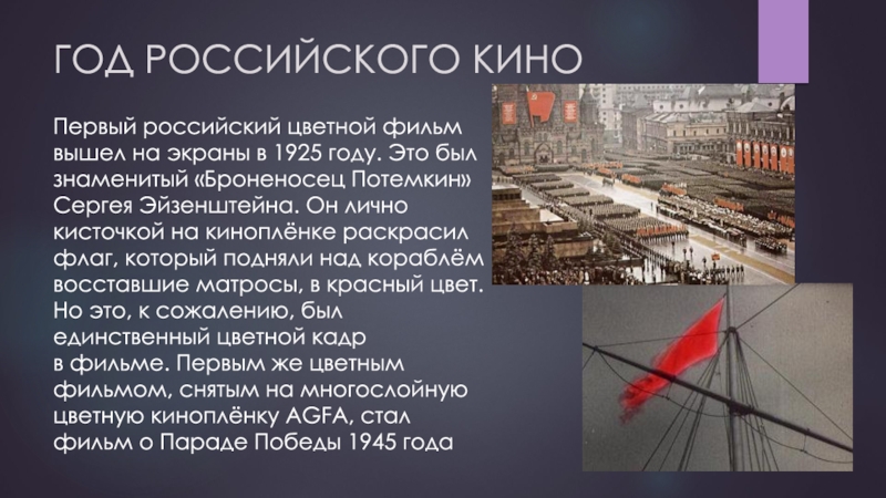 знаменитый «Броненосец Потемкин» Сергея Эйзенштейна. Он лично кисточкой на киноплёнке раскрасил флаг, который подняли над кораблём восставшие матросы, в красный цвет. Но это, к сожалению, был единственный цветной кадр в фильме. Первым же цветным фильмом, снятым на многослойную цветную киноплёнку AGFA, стал фильм о Параде Победы 1945 года