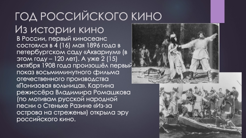 мая 1896 года в петербургском саду «Аквариум» (в этом году – 120 лет). А уже 2 (15) октября 1908 года произошёл первый показ восьмиминутного фильма отечественного производства «Понизовая вольница». Картина режиссёра Владимира Ромашкова (по мотивам русской народной песни о Стеньке Разине «Из-за острова на стрежень») открыла эру российского кино.