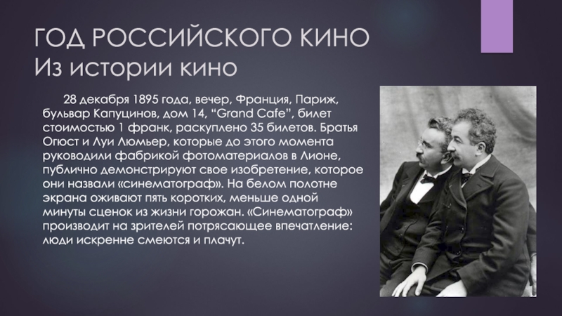 бульвар Капуцинов, дом 14, “Grand Cafе”, билет стоимостью 1 франк, раскуплено 35 билетов. Братья Огюст и Луи Люмьер, которые до этого момента руководили фабрикой фотоматериалов в Лионе, публично демонстрируют свое изобретение, которое они назвали «синематограф». На белом полотне экрана оживают пять коротких, меньше одной минуты сценок из жизни горожан. «Синематограф» производит на зрителей потрясающее впечатление: люди искренне смеются и плачут.