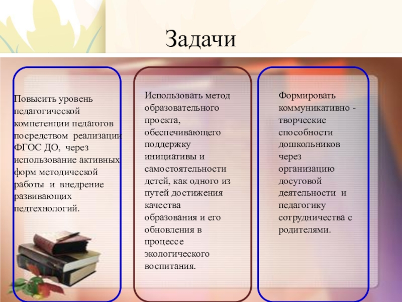 Повысить уровень педагогической компетенции педагогов посредством реализации ФГОС ДО, через использование активных форм методической работы и внедрение развивающих педтехнологий.