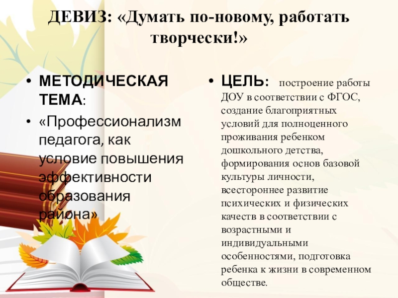 ЦЕЛЬ: построение работы ДОУ в соответствии с ФГОС, создание благоприятных условий для полноценного проживания ребенком дошкольного детства, формирования основ базовой культуры личности, всестороннее развитие психических и физических качеств в соответствии с возрастными и индивидуальными особенностями, подготовка ребенка к жизни в современном обществе.