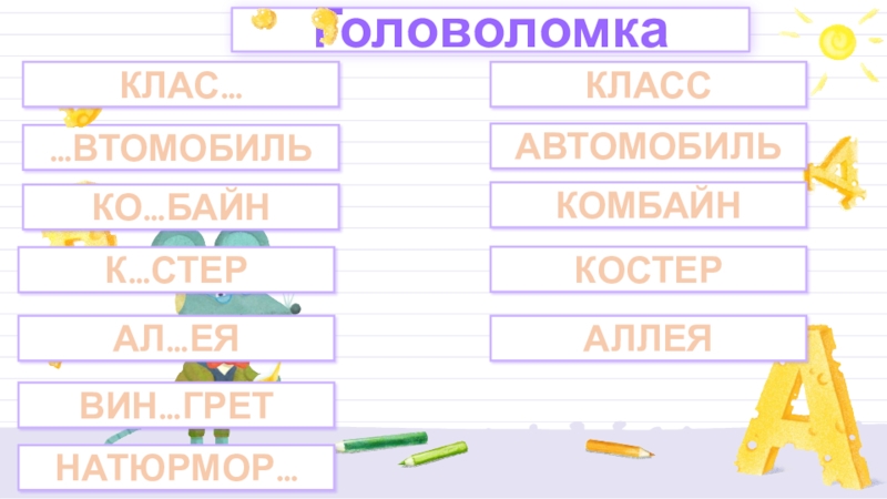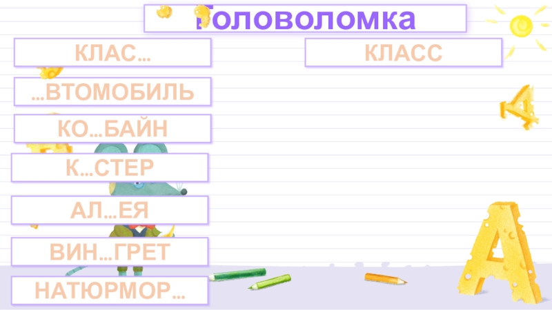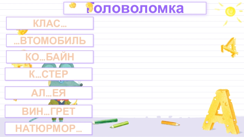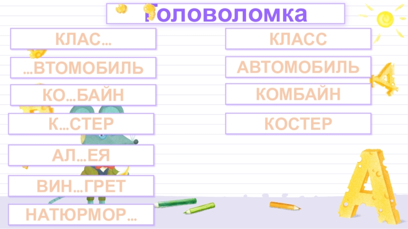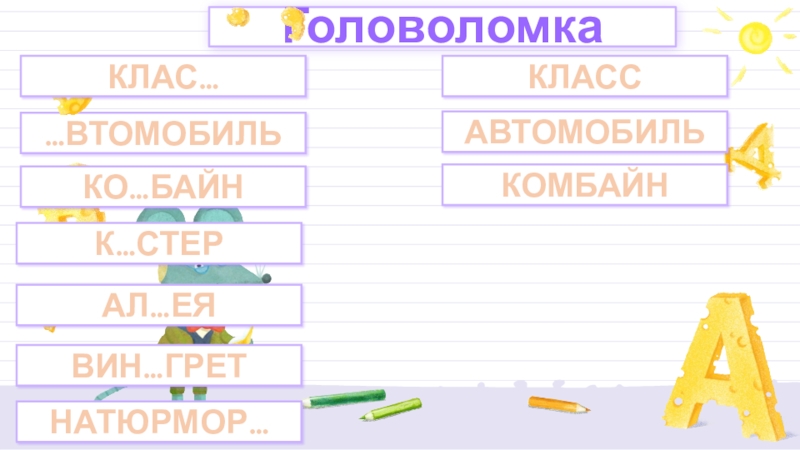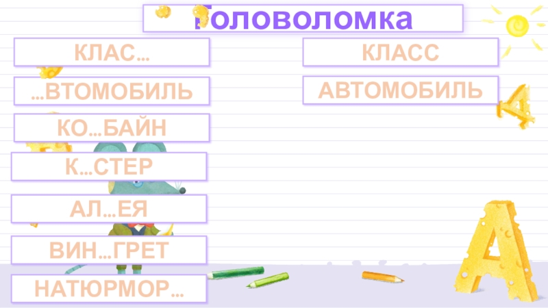 …ВТОМОБИЛЬГоловоломкаКО…БАЙНК…СТЕРАЛ…ЕЯВИН…ГРЕТКЛАС…НАТЮРМОР…КЛАСС