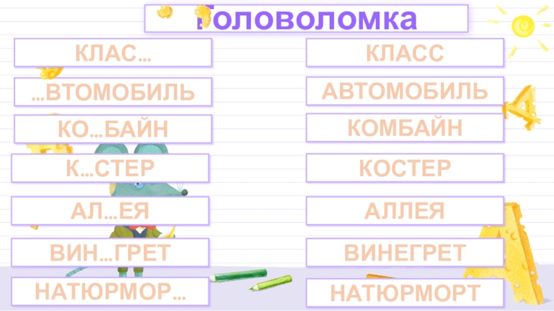 …ВТОМОБИЛЬГоловоломкаКО…БАЙНК…СТЕРАЛ…ЕЯВИН…ГРЕТКЛАС…НАТЮРМОР…КЛАССАВТОМОБИЛЬКОМБАЙНКОСТЕРАЛЛЕЯВИНЕГРЕТ