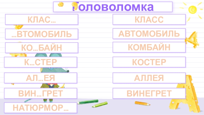 …ВТОМОБИЛЬГоловоломкаКО…БАЙНК…СТЕРАЛ…ЕЯВИН…ГРЕТКЛАС…НАТЮРМОР…КЛАССАВТОМОБИЛЬКОМБАЙНКОСТЕРАЛЛЕЯВИНЕГРЕТНАТЮРМОРТ