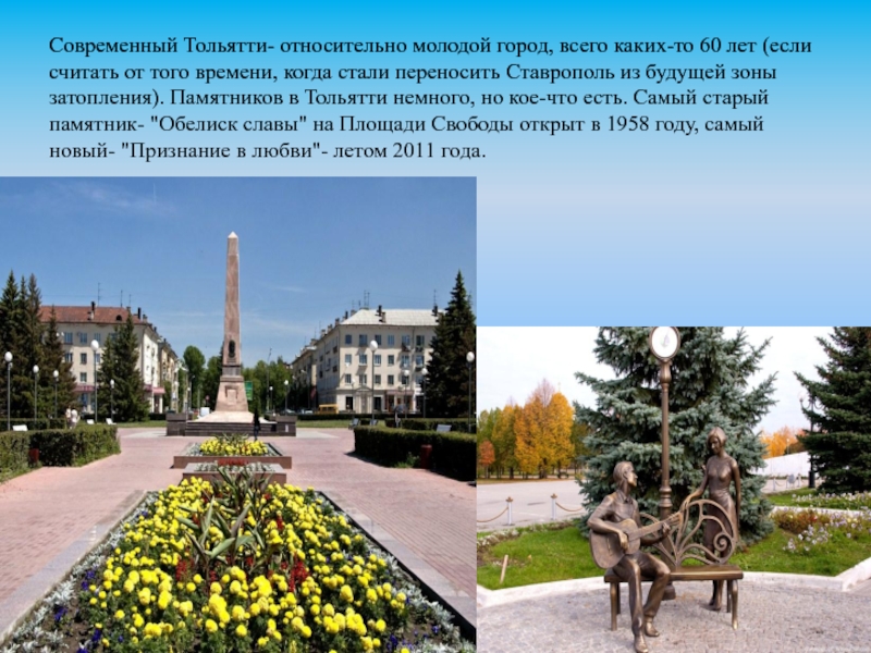 от того времени, когда стали переносить Ставрополь из будущей зоны затопления). Памятников в Тольятти немного, но кое-что есть. Самый старый памятник- "Обелиск славы" на Площади Свободы открыт в 1958 году, самый новый- "Признание в любви"- летом 2011 года.